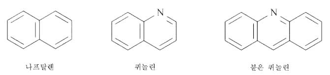 (IJ) À¯µµÃ¼ÀÇ ºÐ·ù ÈÇÐ ÈÇÕ¹°ÀÇ À¯µµÃ¼ÀÇ È£ ´ÜÀ§ÀÇ ºÐ·ù´Â ÅëÄ¢À» Àû¿ëÇÏ¿© °áÁ¤ÇÑ´Ù. ÀÌ ·ùÀÇ ÁÖ Á¦3È£´Â À¯µµÃ¼°¡ ÀáÁ¤ÀûÀ¸·Î µÎ °³ ÀÌ»óÀÇ È£¿¡ ºÐ·ù °¡´ÉÇÒ ¶§ Àû¿ëÇÑ´Ù. ÀÌ ·ùÀÇ ÇÑ È£¿¡ ºÐ·ùÇÏ´Â °æ¿ì¿¡ À¯µµÃ¼´Â ¼ÒÈ£ÁÖ Á¦1È£¸¦ Àû¿ëÇÏ¿© ºÐ·ùÇÑ´Ù. (K) ºÙÀº °í¸®±¸Á¶ ºÙÀº °í¸® ±¸Á¶´Â Àû¾îµµ µÎ °³ÀÇ °í¸®°¡ ÀÖ´Â ±¸Á¶·Î¼ ÀÌ °í¸®µéÀº Çϳª(´Ü Çϳª)·Î °áÇյǾî ÀÖÀ¸¸é¼ ¶ÇÇÑ µÎ °³(´Ü µÎ °³) ¿øÀÚ¸¦ °øÀ¯Çϰí ÀÖ´Ù. ºÙÀº °í¸®±¸Á¶´Â ´Ùȯ½Ä ÈÇÕ¹°(¿¹: ´Ùȯ½Ä źȼö¼Ò, ÇìÅ×·Î°í¸®ÈÇÕ¹°)ÀÇ ºÐÀÚ¿¡¼ ³ªÅ¸³ª´Âµ¥ ¿©±â¿¡´Â µÎ °³ÀÇ È¯½Ä °í¸®°¡ µÎ °³ÀÇ ÀÎÁ¢ ¿øÀÚ¸¦ °®°í ÀÖ´Â °øÀ¯º¯À» °¡Áö°í °áÇÕÇÏ¿© ÀÖ´Â ¹Ù, ¾Æ·¡ÀÇ ¿¹´Â À̸¦ ³ªÅ¸³½ °ÍÀÌ´Ù. º¹ÇÕ °í¸® ±¸Á¶¿¡¼´Â ƯÁ¤ °í¸®ÀÇ µÎ °³ ÀÌ»óÀÇ º¯¿¡ ºÙÀ½ÀÌ ÀϾ ¼ö ÀÖ´Ù. µÎ °³ÀÇ °í¸®°¡ µÎ °³(´Ü µÎ °³)ÀÇ ¿øÀÚ¸¦ °øÀ¯Çϰí ÀÖ´Â ´Ùȯ½Ä ÈÇÕ¹°Àº "¿À¸£Åä-ºÙÀ½(ortho-fused)"À̶ó°í ºÒ¸°´Ù. ÇÑÆí, ÇÑ °³ÀÇ °í¸®°¡ µÎ °³ÀÇ ¿øÀÚ(´Ü µÎ °³)¸¦ ¿¬¼ÓÀûÀ¸·Î Á¢ÃËÇϰí ÀÖ´Â °í¸® Áß µÎ °³ ÀÌ»óÀÇ °í¸®¿Í °¢°¢ °øÀ¯Çϰí ÀÖ´Â ´Ùȯ½Ä ÈÇÕ¹°Àº "¿À¸£Åä(ortho)¿Í Æä¸®(peri) ºÙÀ½"À̶ó°í ÀÏÄþîÁø´Ù. ´ÙÀ½ÀÇ º¸±â´Â ÀÌ¿Í °°Àº µÎ °³ÀÇ ´Ù¸¥ Á¾·ùÀÇ ºÙÀº °í¸®¸¦ ±×¸²À¸·Î ³ªÅ¸³½ °ÍÀÌ´Ù. ÇÑÆí ¾Æ·¡±×¸²Àº °¡±³±¸Á¶(ºÙÁö ¾ÊÀº)·Î µÈ Äû³î¸°(quinoline)ÀÇ ¿¹ÀÌ´Ù. ÀÌ ·ùÀÇ ÇØ¼³ º»¹®¿¡¼ ÈÇÐ½Ä ´ÙÀ½¿¡ ³ª¿À´Â º°Ç¥ "*"´Â ±× ÈÇб¸Á¶¸¦ Á¦29·ù ÇØ¼³¿¡ ´ëÇÑ ºÎ¼Ó¼¿¡¼ ÂüÁ¶ÇÒ ¼ö ÀÖÀ½À» ³ªÅ¸³½´Ù.