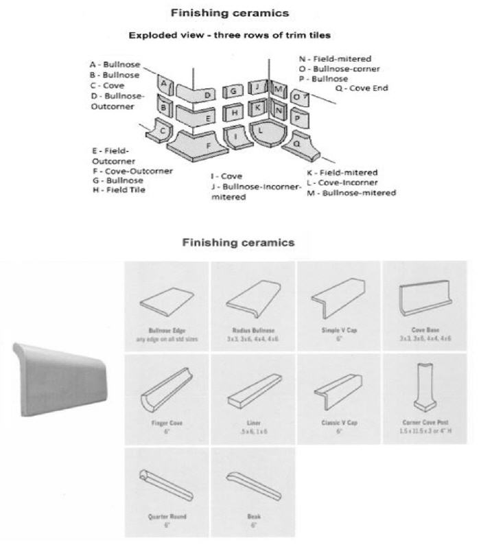 This heading covers ceramic flags and tiles, including quarry tiles, commonly used for paving or for facing walls, hearths, etc. Flags and paving, hearth or wall tiles are thinner in relation to their surface dimensions than are building bricks. Whereas bricks play an essential part in constructional work, forming the very framework of the building, flags and tiles are more especially intended for fixing by cement, adhesive or by other means to the surface of existing walls, etc. They also differ from roofing tiles in that they are usually flat and do not need to be pierced or provided with nibs or otherwise shaped for interlocking and that they are designed to be placed side by side without overlapping. Flags are larger than tiles and are usually rectangular; tiles may be of other geometric shapes (hexagonal, octagonal, etc.). Tiles are mainly used for facing walls, mantelpieces, hearths, floors and paths; flags are more especially used for paving or flooring, or as hearth slabs. Both categories may be made from clays or other inorganic raw materials, usually shaped by extruding or pressing at room temperature, but can be formed by other processes, then dried and subsequently fired at temperatures sufficient to develop the required properties. However types which have to withstand heavy wear are often vitrified, for example, tiles of stoneware, or porcelain (china) or of fired steatite (e.g., tiles for lining grinding mills, etc.). The wear resistance and the vitrification rate vary depending on the structure of tile. These structural features are characterized by the absorption capacity of water. A high water absorption level corresponds to a porous structure. A low water absorption level corresponds to a compact (vitrified) structure. The porosity factor or water absorption coefficient (symbol E) is defined as the percentage of water by mass after saturating the dry sample product (tile) in water. The determination of the level of water absorption is based on the vacuum method set out in ISO standard 10545-3. The formula for calculating the water absorption is given by the following equation : E = {(Mf-Mi) / Mi }¡¿ 100 where : E = Water absorption expressed as a percentage Mi = The dry mass of the specimen Mf = The saturated mass of the specimen Certain ceramic tiles are used solely for paving; unlike bricks, they are usually cubic or in the form of truncated pyramids. In practice, they are normally of stoneware or, exceptionally, of porcelain or china (e.g., flags for pedestrian crossings). The classification of goods in this heading is therefore determined by their shape and size, rather than by their composition; thus bricks suitable for use both in building and for paving (e.g., vitrified bricks) are excluded (heading 69.04). Goods of this heading may be coloured in the mass, marbled, ribbed, channelled, fluted, glazed, etc. Subject to the above conditions, the heading also includes :(1) Finishing ceramics such as bordering, capping, skirting, frieze, angle, corner or other fitting tile pieces employed as complementary elements for finishing off the facing, paving, etc., work, with or without rounded edges, non flat or 3-dimensional, which give them the character of finishing pieces; that would be the case, in particular, for bordering, skirting, frieze, corner pieces, decorative inserts and other ceramic accessories. In these cases, these pieces need to match with the other basic tiles, so their proper surface usually has the same shade or finish of the normal tiles. They are generally sold by piece or by linear metre. (2) Double tiles intended for splitting before use. (3) Terracotta cladding elements used in the building industry for exterior or interior cladding purposes, of various dimensions, with a modular structure, which are attached by, e.g., metal clips to vertical or horizontal metal profiles secured to the walls of the main structure. (4) Mosaic cubes and the like, whether or not on a paper or other backing, characterized by their small sizes. On the other hand, in addition to glazed articles the heading excludes :(a) Tiles specially adapted as table mats, etc. (heading 69.11 or 69.12). (b) Ornaments and the like of heading 69.13. (c) Ceramic tiles specially adapted for stoves (heading 69.14). Subheading Explanatory Note. Subheading 6907.40 Pictures of some of the types of finishing ceramics which are covered by this subheading are reproduced below.