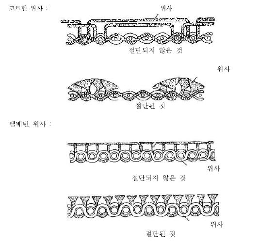 (A) ÆÄÀÏ(pile)Á÷¹°(Á¦5802È£ÀÇ Á÷¹°À» Á¦¿ÜÇÑ´Ù) ÆÄÀÏ(pile)Á÷¹° : Àû¾îµµ ¼¼ °¡´Ú ÀÌ»óÀÇ ¿¬¼Ó»ç(series of thread)·Î ÀÌ·ç¾îÁø´Ù. Áï ÆØÆØÇÑ Àå·ÂÀ» °¡Áø °æ»ç(ÌèÞê : warp thread)¿Í À§»ç(êÕÞê : weft thread)°¡ ¹ÙÅÁõÀ» Çü¼ºÇÏ°í ´Ù¸¥ ÇÑ °¡´ÚÀÇ °æ»ç(ÌèÞê)³ª À§»ç(êÕÞê)°¡ ÆÄÀÏÀ» Çü¼ºÇϰí ÀÖ´Â Á÷¹°ÀÌ´Ù. ÀÌ ÆÄÀÏÀº ¼ú(tuft)À̳ª ·çÇÁ(loop)·Î µÇ¾î ÀÖÀ¸¸ç Á÷¹°ÀÇ Ç¥¸éÀÇ ÀüºÎ³ª ÀϺθ¦ µ¤°í ÀÖ´Ù. À̰ÍÀº º¸ÅëÀÇ °æ¿ì ÇÑÂÊ ¸é¿¡¸¸ ÀÖÁö¸¸ ¶§¶§·Î ¾ç¸é¿¡ ÀÖ´Â ¶§µµ ÀÖ´Ù. °æÆÄÀÏ(warp pile) Á÷¹°(velvets¡¤plush¡¤moquette µî)Àº À§»ç(êÕÞê : weft thread)ÀÇ ¹æÇâ¿¡¼ »ðÀÔµÈ Ã¶»ç À§·Î ÆÄÀÏ °æ»ç(ÌèÞê)¸¦ À¶±â½ÃÄѼ ¸¸µç´Ù. ÀÌ¿Í °°ÀÌ ¸¸µç ·çÇÁ´Â Á¦Á÷ Áß¿¡³ª Á¦Á÷ ÈÄ¿¡ Àý´ÜµÈ´Ù. ±×·¯³ª ¶§·Î´Â ·çÇÁ°¡ ÀÖ´Â ÆÄÀÏÁ÷¹°À̳ª Àý´ÜÇÏÁö ¾ÊÀº ÆÄÀÏÁ÷¹°À» ¸¸µé±â À§ÇÏ¿© À̸¦ Àý´ÜÄ¡ ¾Ê°í ±×´ë·Î ³²°ÜµÎ´Â °æ¿ìµµ ÀÖ´Ù. ÀÌ ·çÇÁ³ª ÆÄÀÏÀ» Àý´ÜÇÏ¿© ¸¸µç ¼ú(tuft)Àº À§»ç(êÕÞê)°¡ À§Ä¡¸¦ °íÁ¤½ÃÄÑ ÁØ´Ù. °æÆÄÀÏ(warp pile) Á÷¹°Àº ¶ÇÇÑ ÇÑ °¡´ÚÀÇ °øÅë ÆÄÀÏ °æ»ç·Î¼ ÇѲ¨¹ø¿¡ µÎ ¸ÅÀÇ Á÷¹°À» Á¦Á÷ÇÔÀ¸·Î½á ¾ò¾îÁø´Ù. ´ÙÀ½¿¡ µÎ ¸ÅÀÇ Á÷¹° »çÀÌÀÇ ÆÄÀÏ °æ»ç¸¦ Àý´ÜÇÔÀ¸·Î½á µÎ ÆÄÀÏÁ÷¹°Àº °¢°¢ ºÐ¸®µÈ´Ù. Àý´ÜµÈ À§ÆÄÀÏ(weft pile)Á÷¹°(velveteen¡¤corduroy µî)Àº ÀϹÝÀûÀ¸·Î À§»ç(êÕÞê)·Î ¸¸µé¾îÁø ÆÄÀÏ(pile)À» °¡Áö°í ÀÖ´Ù. ÀÌ °æ¿ì¿¡ ÀÖ¾î¼ À§»ç(êÕÞê)´Â °æ»ç(ÌèÞê)ÀÇ ¾Æ·¡¸¦ ±³´ë·Î Áö³ª°í ±× ´ÙÀ½¿¡ µÎ °¡´Ú ÀÌ»óÀÇ °æ»ç(ÌèÞê)ÀÇ Ç¥¸é¿¡ ºÎ»óÇÏ¿© ÆÄÀÏÀ» ¸¸µç´Ù. Á¦Á÷ ÈÄ¿¡ Á÷¹°ÀÇ Ç¥¸é¿¡ ºÎ»óµÈ ºÎºÐÀÌ Àý´ÜµÇ°í Àý´ÜµÈ ³¡ºÎºÐÀÌ Á÷¸³ÇÔÀ¸·Î½á ÆÄÀÏÀÌ Çü¼ºµÈ´Ù. ÀÌ¿Í À¯»çÇÑ °á°ú´Â °æ»ç(ÌèÞê)¿¡ ö»ç¸¦ ÆòÇàÇÏ°Ô »ðÀÔ½ÃÅ´À¸·Î½á ¾ò¾îÁö¸ç À§(êÕ)ÆÄÀÏÀº Á¦Á÷ Áß¿¡ Àý´ÜµÈ´Ù. ÆÄÀÏÀÇ ¼ú(tuft)Àº °æ»ç(ÌèÞê)¿¡ ÀÇÇÏ¿© À§Ä¡°¡ À¯ÁöµÈ´Ù. ±× ºÎ»ç(floats)¸¦ Àý´ÜÇÏÁö ¾Ê¾Æ Á÷¸³ÇÑ ÆÄÀÏ(pile)À» °¡ÁöÁö ¾ÊÀº ´Ü°èÀÇ À§ÆÄÀÏ(weft pile) Á÷¹°Àº ÀÌ È£¿¡ Æ÷ÇÔÇÑ´Ù(ÀÌ ·ùÀÇ ÁÖ Á¦2È£ ÂüÁ¶) (B) ¼Å´Ò(chenille)Á÷¹° ¼Å´Ò(chenille)Á÷¹° : Á¦5702È£ÀÇ ¼Å´Ò ¾çźÀÚ¿Í ´ë´ÜÈ÷ À¯»çÇϸç; ¼Å´Ò ¾çźÀÚ¿Í °°ÀÌ ÆÄÀÏ Ç¥¸é(º¸Åë ¾ç¸é)Àº ¼Å´Ò»ç(chenille yarn)¿¡ ÀÇÇÏ¿© ¸¸µé¾îÁø´Ù. ÀÌ ¹°Ç°Àº ÀϹÝÀûÀ¸·Î Ãß°¡ÀûÀ¸·Î ÷°¡µÈ ¼Å´Ò»çÀÇ À§»ç(êÕÞê)·Î ¸¸µé°Å³ª ¹ÙÅÁõÀ» Á¦Á÷ÇÏ´Â Áß¿¡ °æ»ç(ÌèÞê)¿¡ »ö»ó°ú ±æÀ̰¡ ´Ù¸¥ ¼Å´Ò»ç¸¦ »ðÀÔÇÏ¿© ¸¸µç´Ù. ÆÄÀÏÁ÷¹°°ú ¼Å´ÒÁ÷¹°Àº ¿©·¯ °¡Áö Àç·á·Î¼ ¸¸µé¾îÁö¸ç °ß¡¤¾ç¸ð¡¤µ¿¹°ÀÇ ºÎµå·¯¿î ÅС¤¸é¡¤ÀÎÁ¶¼¶À¯´Â ÆÄÀÏ¿ëÀ¸·Î °¡Àå º¸ÆíÀûÀ¸·Î »ç¿ëÇÑ´Ù. ÀÌ Á÷¹°µéÀº ÆòÁ÷À̰ųª¡¤À̶ûÀ» ¸¸µé°Å³ª¡¤¹«´Ì¸¦ ³ÖÀº °Íµµ ÀÖÀ¸¸ç¡¤Á¦Á÷ ÈÄ¿¡ ¸ð¾çÀ» ¾ÐÇüÇÒ ¼öµµ ÀÖÀ¸¸ç; ¹«´ÌÆÄÀÏ Á÷¹°Àº ÆÄÀÏÀÌ Á÷¹° Ç¥¸éÀÇ ÀϺθ¸À» µ¤°í ÀÖ´Â °ÍÀ̰ųª ÆÄÀÏÀÇ Ç¥¸éÀÌ ÀϺκÐÀº Àý´ÜµÇ°í ÀϺκÐÀº ·çÇÁ»óÀÇ ÆÄÀϷμ ÀÌ·ç¾îÁø °Í(ciselé velvet)À» Æ÷ÇÔÇÑ´Ù. µû¶ó¼ À̵éÀº ´ë´ÜÈ÷ ´Ù¾çÇÑ µµ¾ÈÀ» Çü¼ºÇϰí ÀÖ´Ù. ¸ðÇǸ¦ ¸ðÁ¶ÇÏ¿© Á÷Á¶ÇÑ ÆÄÀÏÁ÷¹° (¿¹: ¾Æ½ºÆ®¶óÄ¡¤Ä«¶óÄ𡤸ðÁ¶Ç¥¹ü°¡Á× µî)Àº ¿ª½Ã ÀÌ È£¿¡ ºÐ·ùÇÑ´Ù. ±×·¯³ª ¿¹¸¦ µé¸é, ÆÄÀÏ»óÀ¸·Î ºÀÇÕÇÏ¿´°Å³ª °í¹« °¡°øÇÏ¿© Á¦Á¶ÇÑ ¸ðÁ¶¸ðÇÇ´Â Á¦¿ÜÇÑ´Ù(Á¦4304È£). ÀÌ È£ÀÇ ¿©·¯ °¡Áö Á÷¹°Àº Á¦5702È£ÀÇ ¾çźÀÚ¿Í µ¿ÀÏÇÑ ¹æ¹ýÀ¸·Î Á¦Á¶µÈ´Ù´Â °ÍÀ» ÁÖÀÇÇØ¾ßÇÒ °ÍÀÌ´Ù. ±×·¯³ª À̰͵éÀº ±âº»ÀûÀ¸·Î ¹Ù´Ú¿¡ ±î´Â °ÍÀ¸·Î ÀǵµµÇÁö ¾Ê°í ½Ç³» °¡±¸¿ëÀ̳ª ÀÇ·ù¿ëÀ¸·Î ÀǵµµÇ¾ú´Ù´Â Á¡°ú ÀÌ Á÷¹°Àº ¼¶¼¼ÇÑ Àç·á·Î¼ Á¦Á¶µÇ¾úÀ¸¹Ç·Î ¹ÙÅÁõÀÌ º¸´Ù ´õ¿í À¯¿¬ÇÏ´Ù´Â »ç½Ç·Î ¾çźÀÚ¿Í ¿ëÀÌÇÏ°Ô ±¸º°µÇ¾îÁø´Ù. ÀÌ È£¿¡´Â ´ÙÀ½ °ÍÀ» Á¦¿ÜÇÑ´Ù.(a) ÆÄÀÏÁ÷¹°°ú À¯»çÇÑ ¿Ü°üÀ» ³ªÅ¸³»Áö¸¸ Ư¼ö»ç[¿¹: ºÎŬ·¹(bouclé)½Ç]·Î Á¦Á÷µÇ¾ú°Å³ª ÀÏ¹Ý Á÷¹°ÀÇ Ã³¸®(¿¹: scrapingÀ̳ª teasing)¿¡ ÀÇÇØ Á¦Á¶µÈ ºÎŬ·¹(bouclé)Á÷¹°¡¤¶óƼ³×(ratine)¿Í ±× ¹ÛÀÇ Á÷¹°(ÀϹÝÀûÀ¸·Î Á¦50·ùºÎÅÍ Á¦55·ù±îÁö) (b) Á¦5802È£ÀÇ Å׸®Å¸¿ùÁö(terry towelling fabric) ÀÌ¿Í À¯»çÇÑ Å׸®Á÷¹°°ú ÅÍÇÁÆ®Á÷¹° (c) ¼¼Æø(á¬øë : narrow)Á÷¹°ÀÇ ¹üÁÖ ³»¿¡ Æ÷ÇԵǴ ÆÄÀÏ µîÀÇ Á÷¹°(Á¦5806È£) (d) ÆÄÀÏÇ¥¸éÀÌ Àý´ÜµÇ¾ú°Å³ª ·çÇÁ(loop)°¡ ÀÖ´Â ¸Þ¸®¾ß½º Æí¹°¡¤½ºÆ¼Ä¡º»µù ¹æ½Ä¿¡ ÀÇÇÏ¿© ¸¸µé¾îÁø ¹°Ç°(°æ¿ì¿¡ µû¶ó Á¦6001È£³ª Á¦5602È£) (e) Á¦11ºÎÀÇ ÃѼ³ (