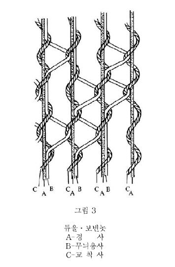 (¥°) Æ¥(tulle)°ú ±× ¹ÛÀÇ ¸ÁÁ÷¹° ÀÌ·¯ÇÑ ¹°Ç°µéÀº Ŀư¡¤Ä§´ëº¸¡¤ÀÌ¿Í À¯»çÇÑ °¡Á¤¿ë ½Ç³»¿ëǰ¡¤º£ÀÏ¡¤¼÷³àº¹ÀÇ Á¦Á¶¡¤ÀÚ¼öõ µî¿¡ »ç¿ëÇÑ´Ù. ÀÌ ¹°Ç°Àº º¸Åë °ß¡¤ÀÎÁ¶¼¶À¯¡¤¸é¡¤¾Æ¸¶ µîÀ¸·Î¼ Á¦Á÷µÈ´Ù. (A) Æ¥(tulle)°ú ±× ¹ÛÀÇ º¸ºó-³Ý(bobbin-net) Á÷¹° : °æ»ç(ÌèÞê)¿Í À§»ç(êÕÞê)·Î¼ ÀÌ·ç¾îÁø Á÷¹°À̸ç À̶§ÀÇ À§»ç(êÕÞê)´Â °¢°³ °æ»ç(ÌèÞê)ÀÇ µÑ·¹¿¡ ²¿ÀÌ¸é¼ °¨°ÜÁö°í ÇÑ °¡ÀåÀÚ¸®·ÎºÎÅÍ ´Ù¸¥ °¡ÀåÀÚ¸®·Î ´ë°¢¼±À¸·Î ÁøÇàµÇ´Âµ¥ À§»ç(êÕÞê)´Â ¹ÝÀ¸·Î ³ª´µ¾î¼ ÇÑ ¹æÇâ°ú ´Ù¸¥ ÇÑ ¹æÇâÀ¸·Î Á÷ÁøÇÑ´Ù(±×¸² 1 ÂüÁ¶). ÀÌ À§»ç(êÕÞê)´Â °æ»ç(ÌèÞê)¿Í ´õºÒ¾î ¹ú·ÁÁø ¸Á¸ñ(open mesh)À» Çü¼ºÇϸç; ÀÌ ¸Á¸ñÀº À°°¢Çü¡¤»ç°¢Çü¡¤´ÙÀ̾ƸóµåÇüÀÌ´Ù(Neuville¸Á). À°°¢ÇüÀÇ Æ¥(tulle)À» º¯Çü½ÃŲ °ÍÀÎ ¸ÞÄ̸°(Mechlin)¸ÁÀº ´ÜÁö µÎ °¡´ÚÀÇ °æ»ç(ÌèÞê) »çÀ̸¦ ±æÀÌ ¹æÇâÀ¸·Î Áö³ª°¡´Â º¸ºó»ç(bobbin thread)¿Í °æ»ç(ÌèÞê)·Î ÀÌ·ç¾îÁø´Ù(±×¸² 2 ÂüÁ¶).  |