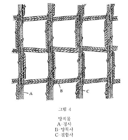 (B) Æ¥ º¸ºó³ò(tulle bobinot) : ¼¼°¡Áö Á¾·ùÀÇ ½Ç(thread)·Î ±¸¼ºµÈ Ưº°ÇÑ Æ¥(tulle)ÀÌ´Ù. ÀÌ Æ¥Àº º¸Åë Æ¥°ú °°ÀÌ °æ»ç(ÌèÞê)¸¦ Á÷¼±À¸·Î ÆòÇàÇÏ°Ô ¹è¿ÇÏ°í ¹«´Ì¿ë»ç(¹«´Ì¸¦ ¸¸µé±â ¶§¹®¿¡ ÀÌ·¸°Ô ºÎ¸¥´Ù)°¡ °æ»ç(ÌèÞê)¸¦ ¿·À¸·Î µû¶ó°¡´Ù°¡ °¡²û ´Ù¸¥ °æ»ç(ÌèÞê)(º¸Åë ÀÎÁ¢»ç)¸¦ ¿Õ·¡ÇÏ¿© »ç´Ù¸®²ÃÀ̳ª ±× ¹ÛÀÇ ÇüÅÂÀÇ °ø°£ÀÌ °¡²û µÚ¼¯¿© ÀÖ´Â »ï°¢ÇüÀÇ ¸Á¸ñÀ» ¸¸µé¸ç ±³Â÷»ç°¡ °æ»ç(ÌèÞê)ÀÇ µÑ·¹¿¡ °¨°ÜÁ® ¹«´Ì¿ë»ç¸¦ ¹¾î ³õÀ½À¸·Î½á ¸¸µé¾îÁø´Ù(±×¸² 3 ÂüÁ¶). µµ¾È °¡¿îµ¥ÀÇ ºÒÅõ¸íÇÑ ºÎºÐÀº ´Ù¼öÀÇ »ï°¢ÇüÀÇ ¸Á¸ñ(mesh)À» ¹ÐÁý½ÃÄÑ ¸¸µç´Ù. (C) ¼¼ °¡ÁöÀÇ ½Ç(thread)À» °¡Áø ¸ÁÁ÷¹° : ÆòÇàÇÑ °æ»ç(ÌèÞê)¡¤¸Á¸ñ»ç¡¤°áÇÕ»ç·Î¼ ÀÌ·ç¾îÁ® ÀÖ´Ù(¿¹: filet net). °¢ ¸Á¸ñ»ç´Â ¼·Î ¼·Î ´Ù¸¥ °æ»ç(ÌèÞê)¸¦ ¼±ÅÃÀûÀ¸·Î ¿·À¸·Î µû¶ó°£´Ù. ±×¸®°í ¸Á¸ñ»ç°¡ ÇÑ °¡´ÚÀÇ °æ»ç(ÌèÞê)·ÎºÎÅÍ ´Ù¸¥ °æ»ç·Î Áö³ª°¨À¸·Î½á »ç°¢ÇüÀÇ ¸Á¸ñÀ» Çü¼ºÇÑ´Ù. °áÇÕ»ç´Â ¸Á¸ñ»ç¿Í °æ»ç(ÌèÞê)ÀÇ ÀÏÁ¤ÇÑ ºÎºÐÀ» ¹¾î ¸ÁÁ÷À» ÀÌ·é´Ù(±×¸² 4 ÂüÁ¶). (D) ¸Åµì ¸ÁÁ÷¹°(knotted net fabric) : ±ÕÀÏÇÑ Á¤»ç°¢ÇüÀ̳ª ´ÙÀ̾ƸóµåÇüÀÇ ¸Á¸ñ(mesh)À» °¡Áö°í ÀÖÀ¸¸ç ÀÌ´Â ½Ç(thread)ÀÌ Ç®·ÁÁöÁö ¾Êµµ·Ï °¢ ¸ðÅüÀ̸¦ ¸ÅµìÇÑ °ÍÀÌ´Ù. ÀÌ ¸ÁÁ÷¹°Àº ¼ÕÀ¸·Î Â¥°Å³ª ±â°è·Î Á¦Á÷µÈ´Ù. ÀÌ È£¿¡´Â ´ÙÀ½ÀÇ °ÍÀ» Æ÷ÇÔÇÏÁö ¾Ê´Â´Ù. (a) Á¦50·ùºÎÅÍ Á¦55·ù±îÁöÀÇ Á÷¹°·Î¼ ´À½¼ÇÏ°Ô Á¦Á÷ÇÑ °Í°ú Á¦5803È£ÀÇ °ÅÁî (b) Á¦5608È£ÀÇ ¸Á(net)À̳ª ±×¹°°¨(netting) (c) º¼ÆÃ Ŭ·Î½º(bolting cloth)(Á¦5911È£) (d) Á¦60·ùÀÇ ¸Þ¸®¾ß½º Æí¹°À̳ª ¶ß°³Áú Æí¹° (e) Á¦11ºÎ ÃѼ³(¥±)¿¡ ±ÔÁ¤ÇÑ ¹°Ç°À¸·Î µÈ Æ¥(tulle)°ú ±× ¹ÛÀÇ ¸ÁÁ÷¹° (¥±) ·¹À̽º(lace) ·¹À̽º´Â ½Ç(thread)À» »óÈ£ ²¿¾Æ¼ ¸¸µç ´Ù¼Ò º¹ÀâÇÑ ¹«´Ì¿ä¼Ò°¡ ¸Á(ÀÌ´Â ¶Ñ·ÇÀÌ °ø°£ÀÌ ÀÖµµ·Ï °¡°øµÈ ¹ÙÅÁõÀ» Çü¼ºÇÏ¸ç º¸Åë ±ÔÄ¢ÀûÀÎ Å©±â¿Í ¸ð¾çÀ» °¡Áø´Ù)À̳ª Àå½Ä ¿¬°áÄÚ(¹«´ÌÈ¿°ú¸¦ ³ªÅ¸³½´Ù)·Î ¿¬°áµÇ¾î ÀÖ´Â °ø°£ÀÌ ÀÖµµ·Ï °¡°øµÈ Àå½ÄÀû Á÷¹°ÀÌ´Ù. ÀÌ ¹«´Ì¿ä¼Ò¿Í ¸Á¸ñ ¶Ç´Â Àå½Ä ¿¬°áÄÚ Á¦Á÷¹è°æÀº º¸Åë µ¿½Ã¿¡ ÀÌ·ç¾îÁöÁö¸¸ ¶§·Î´Â ¹«´Ì¿ä¼Ò°¡ º°µµ·Î ¸¸µé¾îÁø µÚ¿¡ Á¶ÇÕÇÏ´Â °æ¿ìµµ ÀÖ´Ù. ·¹À̽ºÀÇ ±âº»ÀûÀΠƯ¼ºÀº ÀÇÀå¿ä¼Ò°¡ ±âÁ¸ÀÇ ¹ÙÅÁõ À§¿¡ °¡°øµÇÁö ¾Ê¾Ò´Ù´Â °ÍÀÌ´Ù. ±×·¯¹Ç·Î ÀÌ È£ÀÇ ºÐ·ù ¸ñÀû»ó ·¹À̽º¿Í À¯»çÇÑ ¿Ü°üÀ» °¡Áö°í ÀÖ°í ¶§·Î´Â ·¹À̽º·Î ¾Ë·ÁÁ® ÀÖÀ¸³ª(¿¹: filet lace) ½ÇÁ¦´Â Æ¥(tulle)À̳ª ¸ÁÀ¸·Î µÈ ¹ÙÅÁõÀÇ ¸Á¸ñÀ» ä¿ì°Å³ª Àå½ÄÇÏ¿© ¸¸µé°Å³ª ¹ÙÅÁõ¿¡ ¾ÆÇÁ¸®ÄÉ °¡°øÀ» ÇÏ¿© ¸¸µç ¹°Ç°Àº Æ÷ÇÔÇÏÁö ¾Ê´Â´Ù. ÀÌ °æ¿ì¿¡ ÀÖ¾î¼ ¹ÙÅÁõÀÇ ÀüºÎ³ª ÀϺΰ¡ Á¦°ÅÇÑ °ÍÀÎÁö¿¡ »ó°ü¾ø´Ù. ÀÌ·¯ÇÑ ¹°Ç°Àº ÀÚ¼ö¹°Ç°À¸·Î¼ Á¦5810È£¿¡ ºÐ·ùÇÏ¸ç ¶ÇÇÑ ÀÚ¼öµÈ ÁøÁ¤ÇÑ ·¹À̽º¿Í ¾ÆÇÁ¸®ÄÉ °¡°ø¿¡ ÀÇÇÏ¿© ¸¸µé¾îÁø ÀÎÅ©·¯½ºÆ¼µå ·¹À̽º(encrusted lace)µµ ÀÚ¼ö¹°Ç°À¸·Î¼ Á¦5810È£¿¡ ºÐ·ùÇÑ´Ù. ¶ÇÇÑ ÀÌ È£¿¡´Â ¼ÕÀ¸·Î ¸¸µé°Å³ª ±â°èÀûÀ¸·Î ¸Þ¸®¾ß½º ÆíÁ÷µÈ °ø°£ÀÌ ÀÖµµ·Ï °¡°øÇÑ ¹°Ç°Àº Á¦¿ÜÇÑ´Ù(Á¦60·ù). ¸Þ¸®¾ß½º Æí¹°Àº ƯÈ÷ °ß°íÇÑ ºÎºÐ¿¡ ÀÖ¾î¼ÀÇ µ¶Æ¯ÇÑ ¸Þ¸®¾ß½º ÆíÁ÷¹æ¹ý¿¡ ÀÇÇÏ¿© ½Äº°µÉ ¼ö ÀÖ´Ù. Æ¥(tulle)°ú °ÅÁ ´À½¼ÇÏ°Ô Á¦Á÷ÇÑ Á÷¹°°ú´Â ´Þ¸® ·¹À̽º´Â ¶Ñ·ÇÇÏ°Ô °æ»ç(ÌèÞê)¿Í À§»ç(êÕÞê)¸¦ °®°í ÀÖÁö ¾Ê´Ù. ·¹À̽º´Â °¡²û ÇѰ¡´ÚÀÇ ½Ç(thread)·Î¼ ¸¸µéÁö¸¸ ÇѰ¡´Ú ÀÌ»óÀÇ ½ÇÀÌ »ç¿ëµÉ ¶§¿¡µµ ÀÌµé ½ÇÀº µ¿ÀÏÇÑ ±â´ÉÀ» ¼öÇàÇϰí ÀÖ´Ù. ·¹À̽º´Â ¼ÕÀ¸·Î ¸¸µé°Å³ª ±â°èÁ÷À¸·Î Á¦Á÷ÇÑ´Ù. ¼ÕÀ¸·Î ¸¸µç ÁÖ¿äÇÑ ·¹À̽º´Â ´ÙÀ½°ú °°´Ù. (A) ´Ïµé Æ÷ÀÎÆ®(needlepoint) ·¹À̽º : ÀÌ ·¹À̽º´Â µµ¾ÈÀÌ ÀÖ´Â Á¾À̳ª ¾çÇÇÁö(åÏù«òµ)ÀÇ ½ÃÆ®(sheet) À§¿¡ ÇϳªÀÇ Ä§À¸·Î ¸¸µç´Ù. ÀÌ ·¹À̽º´Â ±×·ÁÁ® ÀÖ´Â ¹«´ÌÀÇ ¿ÜÇü¿¡ µû¶ó¼ ¸¸µé¾îÁö¸ç ·¹À̽º¸¦ ±¸¼ºÇϰí ÀÖ´Â ½Ç(thread)Àº ¹«´Ì°¡ ÀÖ´Â Á¾À̸¦ ²ç¶ÕÁö ¾Ê°í Á¾ÀÌ À§¿¡ ³õ¿©Á® Àִµ¥; ÀÌ °æ¿ì¿¡´Â ÇÁ·¹ÀÓ»ç(frame thread) Áï, ·¹À̽ºÀÇ ÃÖÃÊÀÇ °ñÁ¶¸¦ Çü¼ºÇϰí ÀÖ´Â ½ÇÀº ·¹À̽º °¡°øÀ» ¿ëÀÌÇÏ°Ô Çϱâ À§ÇÏ¿© Å©·Î½Ì ¹Ù´ÃÄÚ(stitch)¿¡ ÀÇÇÏ¿© ÀáÁ¤ÀûÀ¸·Î ¹«´Ì¿¡ ºÎÂøµÇ¾î ÀÖ´Ù. ´Ïµé Æ÷ÀÎÆ® ·¹À̽º¿¡´Â Alençon¡¤Argentan¡¤Venetian µîÀ» Æ÷ÇÔÇÑ´Ù. (B) º¸ºó ·¹À̽º(bobbin lace : pillow lace) : ¿©·¯ °³ÀÇ º¸ºó¿¡ °¨°Ü ÀÖ´Â ¿©·¯ °¡´ÚÀÇ ½Ç(thread)À» "ħ(ö× : pillow)"À̳ª "Äí¼Ç(cushion)" À§¿¡¼ Ç